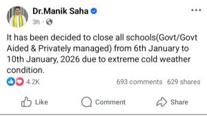 রাজেশ চন্দ্র দেবনাথ ★ সাশ্রয় নিউজ ডেস্ক, আগরতলা : শীতের জন্য স্কুল ছুটি ঘোষণা করল ত্রিপুরা সরকার। প্রচণ্ড শীতে জনজীবন বিপর্যস্ত। এবার এই শীতের জন্য ত্রিপুরা রাজ্যের সমস্ত স্কুল ৬ জানুয়ারি থেকে ১০ জানুয়ারি অব্দি বন্ধ ঘোষণা করা হল। সোমবার রাজ্যের মুখ্যমন্ত্রী ডা. মানিক সাহা সামাজিক যোগাযোগ মাধ্যমে এ ঘোষণা করেন। অতিরিক্ত শীতের কারণে স্কুলের ছাত্রছাত্রীদের খুবই সমস্যা হচ্ছিল। শীতের পারদ নেমে চলছিল। তাই আগামীকাল (মঙ্গলবার) থেকে ১০ জানুয়ারি অব্দি স্কুল বন্ধ ঘোষণা করা হয়।