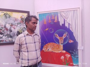 Speaking about his recent participation in an art camp and workshop, Prasad described the experience as “unique and beautiful.” He shared that the camp focused on live artwork, allowing artists to create in real time. His subject for the live painting session was *Swadeshi*, a theme he continues to develop in his work. Prasad mentioned that he was introduced to the camp by Jitendra Sir and Rakhi Madam, whose encouragement enabled his participation in the event.