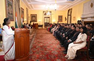 সাশ্রয় নিউজ ★ নতুন দিল্লি : রাষ্ট্রপতি ভবনে একটি গুরুত্বপূর্ণ অনুষ্ঠানে রাজ্য সিভিল সার্ভিস থেকে পদোন্নতির মাধ্যমে ভারতীয় প্রশাসনিক পরিষেবায় (IAS) অন্তর্ভুক্ত এবং লাল বাহাদুর শাস্ত্রী ন্যাশনাল অ্যাকাডেমি অব অ্যাডমিনিস্ট্রেশন (Lal Bahadur Shastri National Academy of Administration, LBSNAA)-এ ১২৮তম প্রেরণা প্রশিক্ষণ কর্মসূচীতে অংশগ্রহণকারী আধিকারিকরা রাষ্ট্রপতির সঙ্গে সাক্ষাৎ করেন। এই উপলক্ষ্যে রাষ্ট্রপতি দ্রৌপদী মুর্মু (Droupadi Murmu) তাঁদের উদ্দেশ্যে বক্তব্য রাখেন। এবং উন্নত ভারত গঠনে প্রশাসনিক নেতৃত্বের বিস্তৃত ভূমিকা নিয়ে দিকনির্দেশনা দেন। রাষ্ট্রপতি বলেন, ‘রাষ্ট্র নির্মাণের প্রক্রিয়ায় আপনাদের ভূমিকা অত্যন্ত গুরুত্বপূর্ণ। এখন আপনাদের দায়িত্ব কেবল জেলা বা রাজ্য স্তরের সীমায় আবদ্ধ নয়; তার চেয়ে অনেক বিস্তৃত।’ তাঁর মতে, বর্তমান সময়ে প্রশাসনিক চ্যালেঞ্জ মোকাবিলায় বিভাগীয় সীমারেখা অতিক্রম করে সমন্বিত দৃষ্টিভঙ্গি গ্রহণ করা জরুরি। ‘সহযোগিতামূলক কাজের মাধ্যমে প্রাতিষ্ঠানিক সামঞ্জস্য বাড়াতে হবে এবং শাসন-ব্যবস্থাকে আরও শক্তিশালী করতে হবে,’ উল্লেখ করেন তিনি।